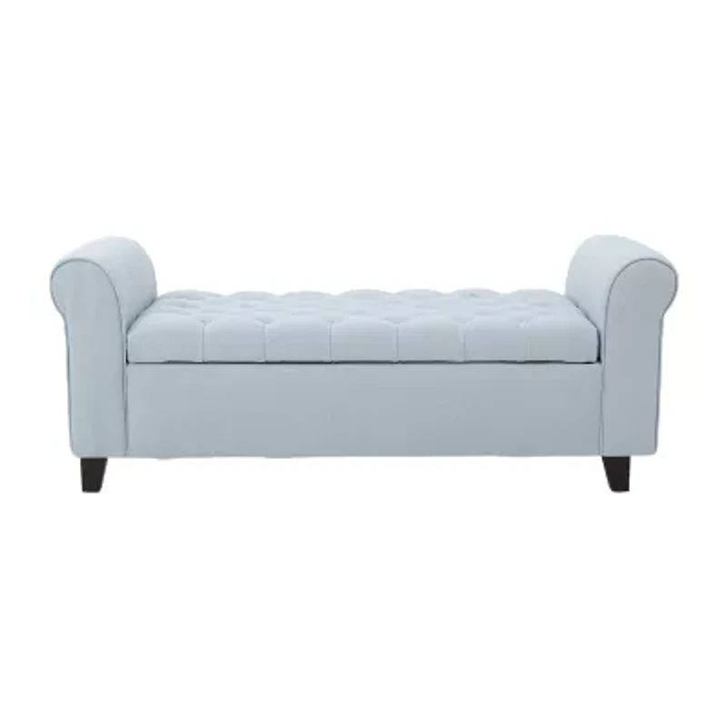 Unclutter your home with an elegant companion that will greet your guests with a refined flourish. Perfect for your living room, foyer, or bedroom, this ottoman bench boasts convenient storage space while offering your decor a graceful atmosphere. With rolled arms, lovely button-tufting and soft pressure hinges, this ottoman is an ideal addition for any home, adding class and function to your interior space. This ottoman will tie your home together with its versatility and stunning looks that will impress for years to come.