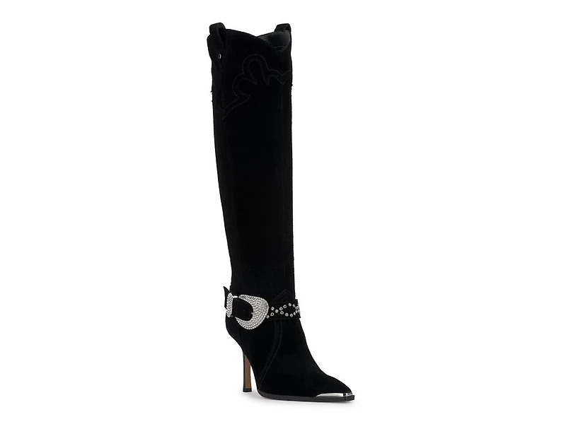 The Kenzin Western boot from Jessica Simpson brings standout flair to any outfit. From the cowboy stitching patterned shaft detail to the studded ankle strap and polished buckle, each accent of the pointed toe boot speaks of your unique fashion taste. A slender heel completes the look with graceful edge.
