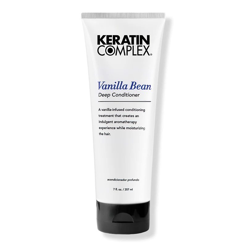 VANILLA BEAN DEEP CONDITIONER 7OZ. Benefits: Deeply conditions and moisturizes all hair types, especially dry, dull, damaged, and over processed hair. Formulated without sodium chloride to protect the longevity of Keratin Complex smoothing treatments. Can be used with or without a smoothing treatment. No added parabens. No added sodium lauryl sulfate (SLS). Key Ingredients: A blend of Keratin Complex's proprietary Signature Keratin, wheat, and soy proteins restore moisture and shine to improve hair's overall look and feel. Vanilla fruit extract conditions and smooths parched strands. Jojoba oil conditions, providing much-needed moisture to dry hair. Blend of botanical extracts nourishes to promote healthy hair and scalp. :
