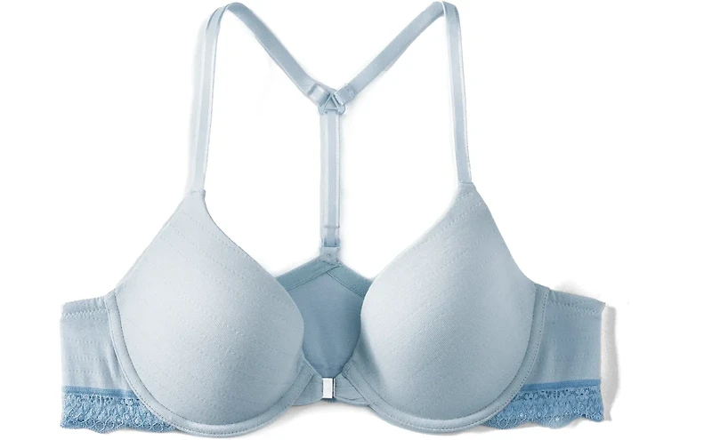 This sweet bra in light blue is the perfect wardrobe refresh. With molded cups in super soft fabric and subtle lace trim, this front close is as sweet as it is functional.