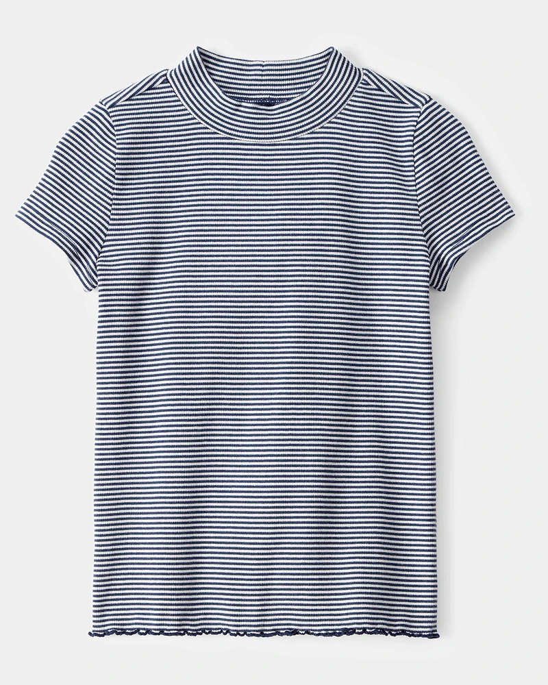 The perfect start to her new favorite outfit, this stripe top comes complete with a mock neck design and a lettuce edge hem for added style.