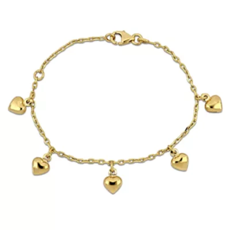 Celebrate love and connection with this charming heart station bracelet, designed to bring a warm, meaningful touch to any look. Crafted in luminous 14K yellow gold, the five heart charms are delicately placed along the chain, creating a graceful and balanced design. Its timeless style makes it perfect for everyday wear or special moments. The elegant silhouette adds a subtle sparkle that feels both modern and heartfelt. A beautiful expression of affection, designed to be cherished for years to come. Lobster closure Polished finish Warranty available, 60 days Italy Imported Product Specifications 5.5" Material & Care 14K Yellow Gold Metal, Yellow Gold Clean with a soft cloth.