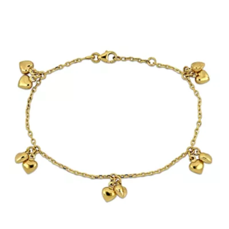 Celebrate love and connection with this beautifully designed double heart charm bracelet. Crafted in radiant 14K yellow gold, the two hearts are delicately placed along the chain, symbolizing unity and affection. Its elegant station design creates a soft, flowing look that feels both modern and timeless. Perfect for everyday wear or special occasions, it adds a graceful touch to any outfit. A meaningful piece that speaks from the heart and shines with lasting beauty. Lobster closure Polished finish Warranty available, 60 days Italy Imported Product Specifications 7.5" Material & Care 14K Yellow Gold Metal, Yellow Gold Clean with a soft cloth.