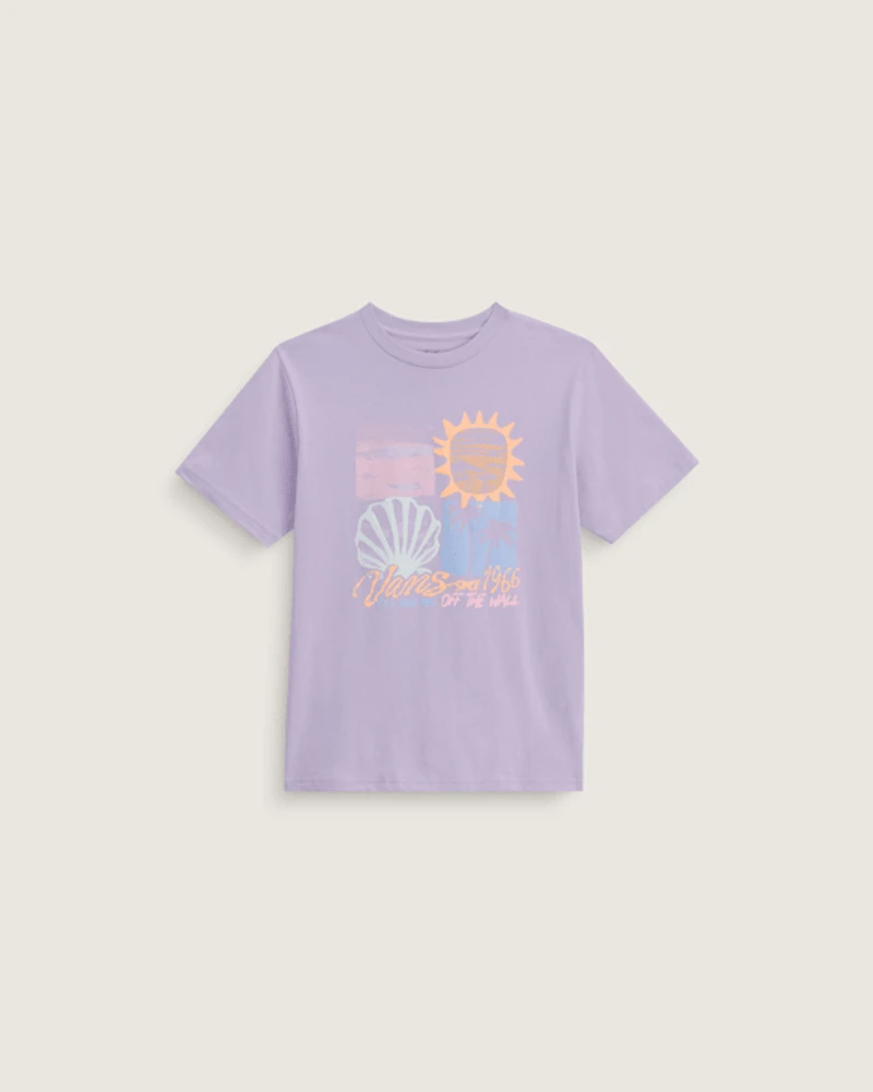 This soft, lightweight jersey T-shirt keeps kids comfortable from school to shore, with a bold front graphic that mashes up shells, sun, and Vans heritage so they can rep the coast every day.