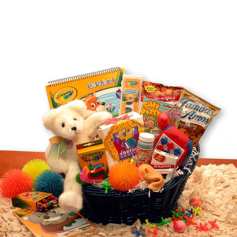 Have a special child on your list with a Birthday coming up, or maybe their a little under the weather? This fun-filled gift basket is sure to brighten their day and keep them busy for hours to come. We've included some tasty snacks such as Cracker Jacks, Chocolate chip cookies, and more to give them house of munching good times.