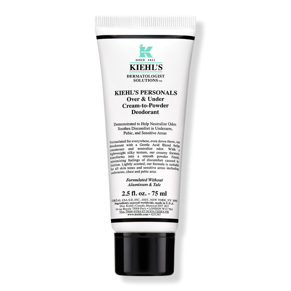 PERSONALS OVER UNDER DEODORANT. Benefits: 96 Hours of Odor Control*. Cream-to-Powder formula with a dry-touch finish to help minimize feelings of discomfort due to friction. Formulated without Talc or Aluminum. Formulated with a Gentle Acid Blend. Tested by Dermatologists and Gynecologists for safety. Suitable for all skin types, including sensitive skin. *Based on expert odor evaluation in the armpit area.. Key Ingredients: Gentle Acid Blend: made of three acids - gentle mandelic, PHA, and lactic - this blend is specially formulated to be gentle on even the most delicate skin and intimate areas, while helping to gently encourage cell turnover, improve skin texture, and neutralize and counteract odor. Plant-Derived Starch: derived from corn fibers, this plant-derived starch contributes to the cream-to-powder finish in Kiehl's formula, which leaves a dry-feel on skin that helps act as a barrier, reducing discomfort due to friction. :