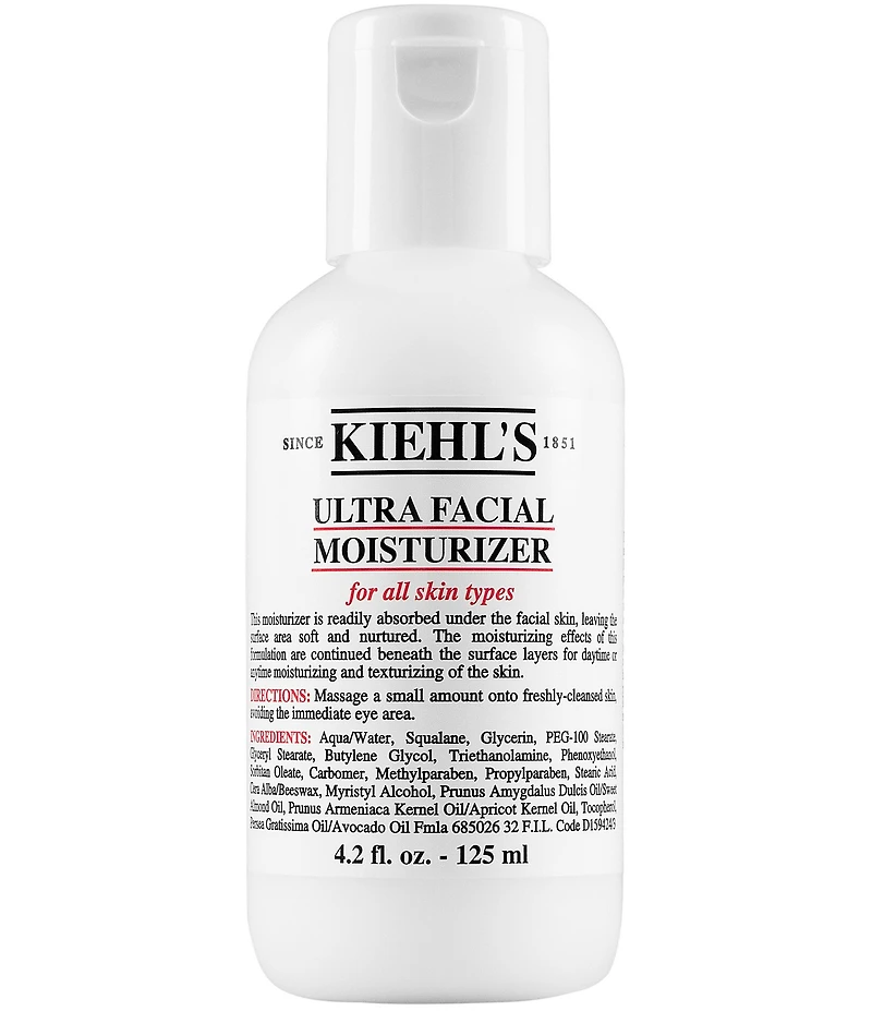 A daily facial moisturizer with 24-hour hydration. This daily moisturizer helps leave skin nourished with all-day hydration. Infused with Squalane and Glycerin, this formula helps soften and moisturize skin. Readily absorbs into facial skin, helping to leave it soft and nurtured all day Helps keep skin moisturized with 24-hour hydration Formulated with Squalane and Glycerin For all skin types How to Apply Ultra Facial Moisturizer: After cleansing and toning, massage a small amount of moisturizer onto skin Avoid the immediate eye area Can be used morning and night and throughout the day as needed Key Ingredients: Squalane - A signature Kiehl's ingredient, Squalane is a highly-refined botanical lipid derived from olives. With an exceptional affinity to skin, Squalane absorbs easily and is known to help replenish skin's barrier keeping it soft, supple and moisturized. Glycerin - Glycerin, a well-known skincare ingredient, is highly compatible and naturally occurring within skin. Within our formulas, it is a powerful humectant known to help retain moisture and soften skin.