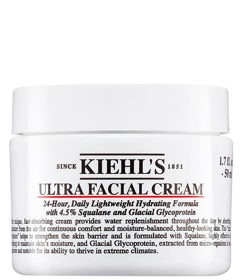 Discover Kiehl's #1 face cream formulated with 4.5% Squalane, Glacial Glycoprotein and Pro-Ceramides to strengthen your skin's moisture barrier for softer, smoother skin and 72-hour hydration. What It Does: Kiehl's #1 ultra hydrating facial cream with 4.5% Squalane has a unique lightweight texture and lasting 72-hour hydration to leave skin softer and visibly healthier. Formulated with Squalane, Glacial Glycoprotein and Pro-Ceramides, this non-greasy, lightweight moisturizer is clinically demonstrated to hydrate 15 layers deep for softer, smoother, and healthier looking skin. Paraben-free & fragrance free. Ultra Facial Cream has received the National Eczema Association's Seal of Acceptance ™ What It's Good For: Provides lasting 72-hour hydration for soft, smooth, healthy-looking skin* Strengthens skin's barrier and hydrates up to 15 surface layers deep** Repairs the skin barrier in just 1 hour*** Absorbs into skin easily with an ultra-lightweight texture Tested in everyday and extreme environments For all skin types, including sensitive skin. Suitable for men, too. Key Ingredients: Squalane: Squalane is a highly refined botanical lipid derived from sugar cane. With an exceptional affinity to skin, this ingredient absorbs easily and is known to help replenish skin's barrier keeping it soft, supple and moisturized. Glacial Glycoprotein: Originally sourced from Antarctic sea glaciers, Glacial Glycoprotein helps to deeply hydrate and maintain skin's moisture balance. Each time our Glacial Glycoprotein is produced, it's done in an environmentally friendly manner, without further extraction of the glaciers, making this skincare ingredient a renewable raw material. Pro-Ceramides: Ceramides are lipids that are naturally occurring in the outer layers of skin. Pro-Ceramides make up a large portion of a healthy skin barrier. Kiehl's formula with Pro-Ceramides helps to reinforce skin's barrier strength and help skin better resist external disruptors. How to Use: After cleansing and toning, apply a dime-sized amount of Kiehl's hydrating facial cream to skin. Use twice daily, both day and night as the ultimate compliment to your skincare routine. *72-hour hydration results based on an instrumental study. **In the stratum corneum. Based on an instrumental study vs untreated skin. *** Barrier repair results based on an instrumental study on tape-stripped skin.