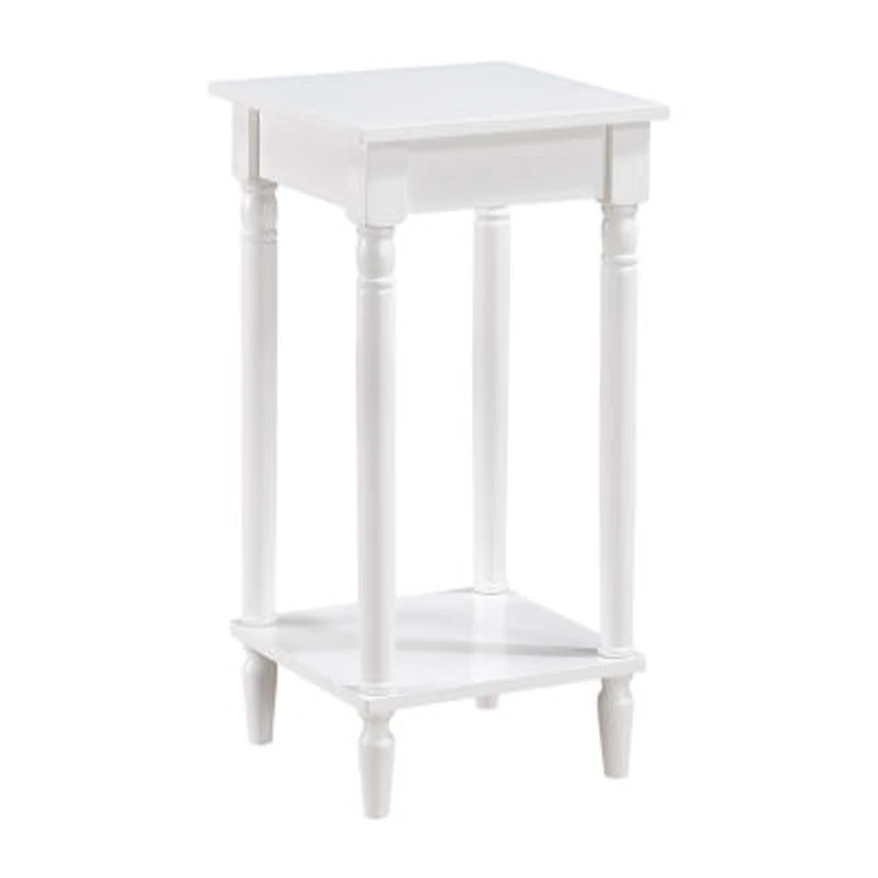 The French country Kim end table with shelf by convenience concepts will add the ultimate touch of class and elegance to your living space. This simple yet sophisticated piece will stand out with its beautifully turned and sculpted legs. Designed with practicality in mind, this traditional side table provides two tiers of shelves to display favorite home accents or your morning cup of coffee. Place it beside your favorite armchair, in a cozy reading nook, or use as a nightstand. Assembly is easy thanks to no tools needed to put this traditional piece together. Constructed from solid and manufactured wood. This table is sure to make a lasting impression. Embrace the classic charm of the French country collection with coordinating pieces by convenience concepts, each sold separately.