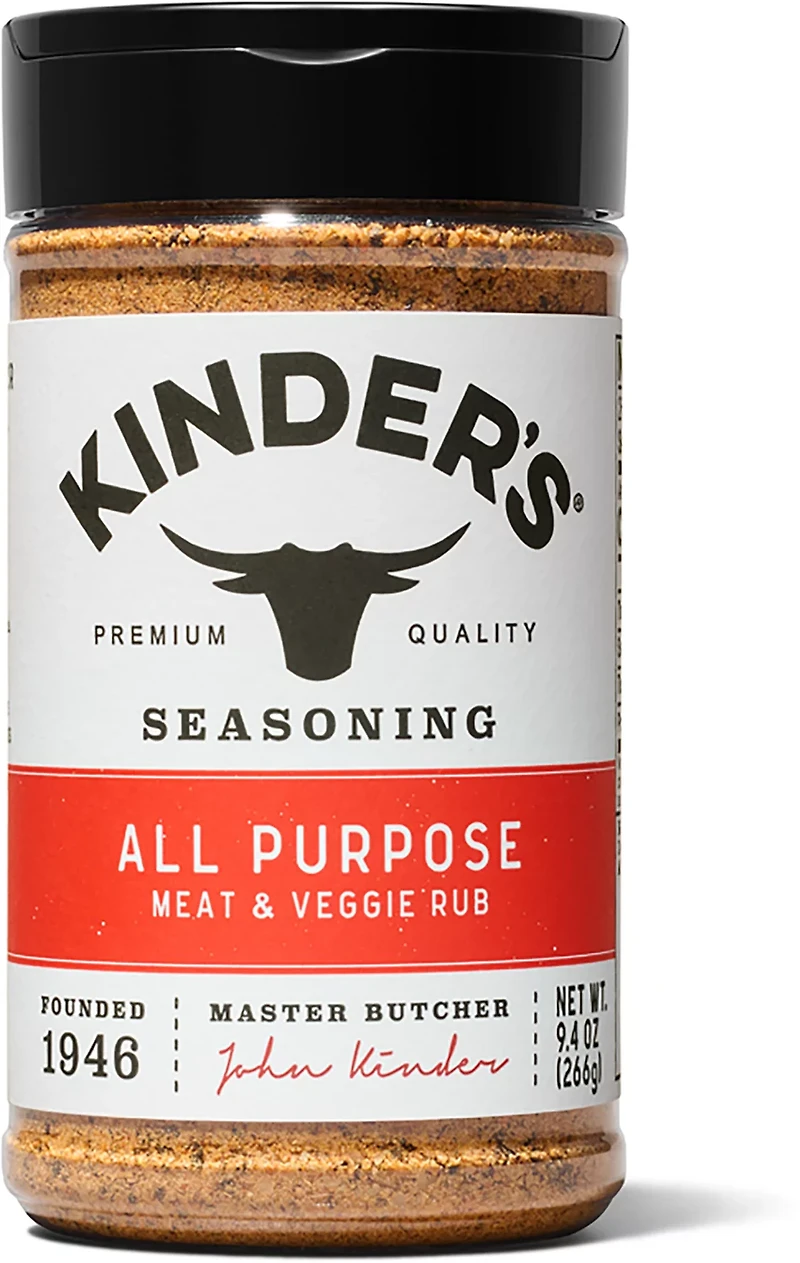 Grill, smoke and sauté your favorite food with the Kinder's All Purpose Seasoning. This delicious blend of sea salt, garlic, spices and chilis pairs well with barbecue chicken, chicken thighs, beef, fish, pork chops, shredded pork BBQ, veggies and rotisserie chicken.