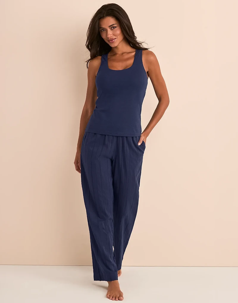 The Kirsten Dark Blue knit set is a tailored-essentials lounge look that brings comfort and polish together. It features a knit tank with built in shelf for support and a woven jacquard pant with elasticated waistband. (Available in sizes XS-XL.)