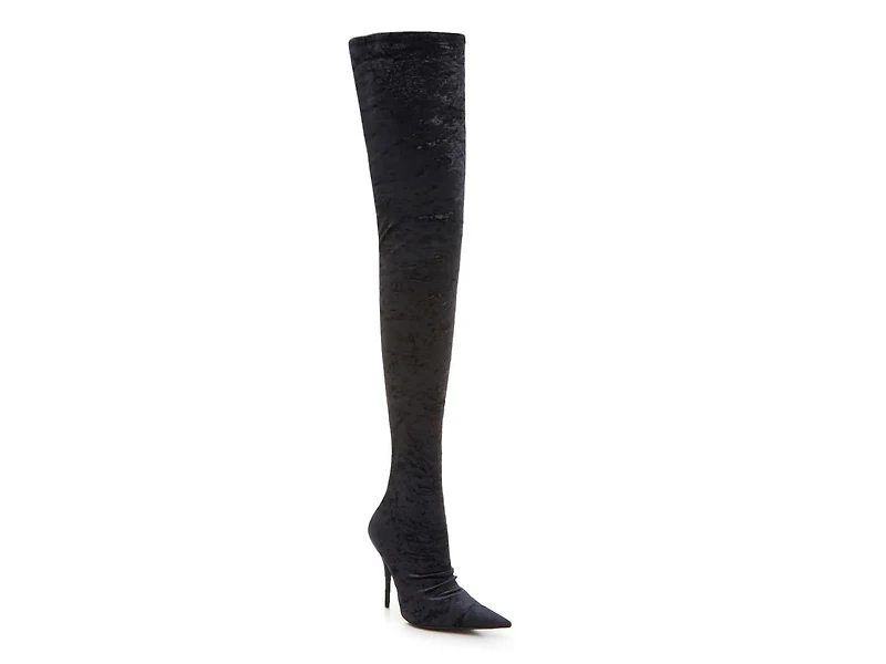 With a form-fitting silhouette, a pointed toe, and a thin stiletto heel, the Knife thigh high boots from Balenciaga showcase a sleek style. This over-the-knee pair is crafted with a super soft material made of crushed velvet that adds a textured touch to any look.