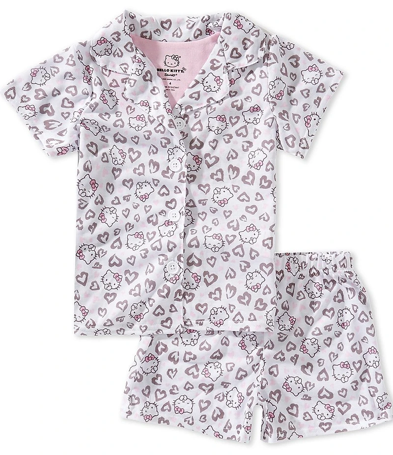 From Komar Kids, this 2-piece set features: Top: All over "Hello Kitty" print Notch collar Short sleeves Piping detail Button-front closure Bottoms: Matching pajama shorts Elastic waist Pull-on styling Care: Polyester/Cotton Flame-resistant polyester Machine wash/tumble dry Imported.