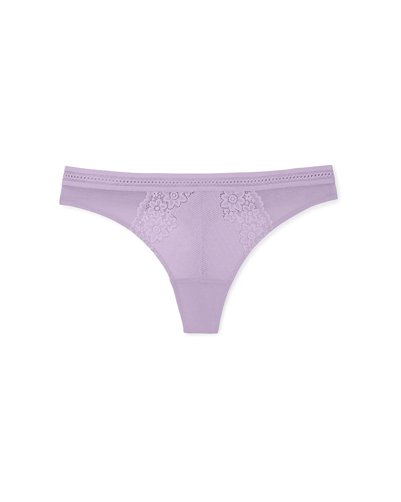 The Kora Thong Medium Purple lace thong is a sultry essential for your top drawer. Effortlessly elegant, it features a - Thong panty, pull-on design, and Sheer material. (Available in sizes XS-XL.)