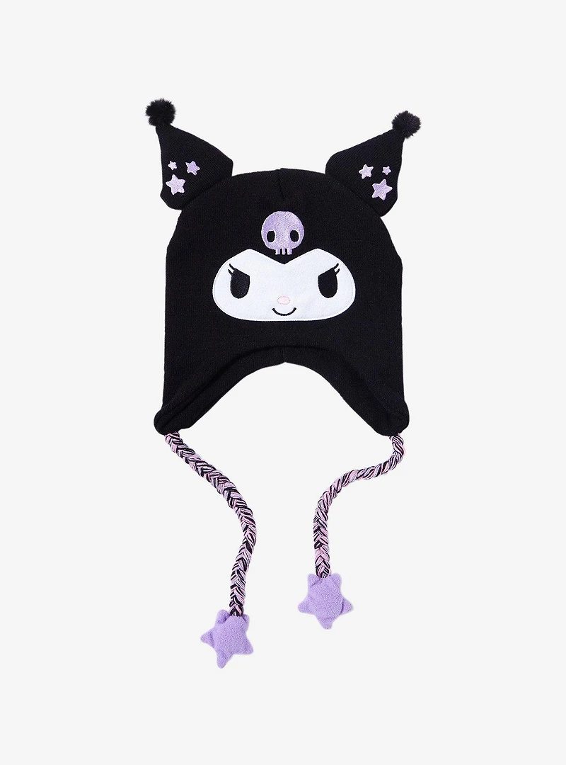 Look like a star with this devilishly cute Sanrio beanie! It features Kuromi's face and her iconic ears up top that have embroidered stars. Comes with braided tassels with star pompoms at the ends.