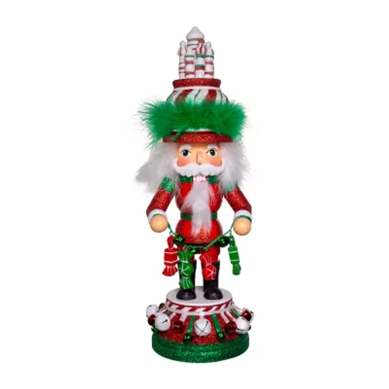 Hollywood Nutcrackers is a whimsical collection of nutcrackers created exclusively for Kurt S. Adler, Inc. and features an assortment of designs that put a unique, vibrant, memorable twist on traditional nutcrackers. This 15-inch Red, Green and White Candy Tower Hat Nutcracker is a fun and festive addition to any home or office holiday decor. This design features a nutcracker in a red and green glittered suite holding a strand of green and red candy. His hat is a red, white and green peppermint candy and he is standing on a red and green glittered base decorated with matching jingle bells. This nutcracker is for decorative use only.