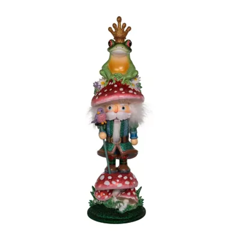 Hollywood Nutcrackers is a whimsical collection of nutcrackers created exclusively for Kurt S. Adler, Inc. and features an assortment of designs that put a unique, vibrant, memorable twist on traditional nutcrackers. This 16.5-inch unique piece is a fun, colorful new take on the Frog Prince. Wearing shades of red, blue, and tan this glittery, quirky piece is standing on a glittered mushroom base and holds a bird topped staff and is topped with a mushroom hat with a frog prince, complete with a regal gold crown. This nutcracker is for decorative use only.