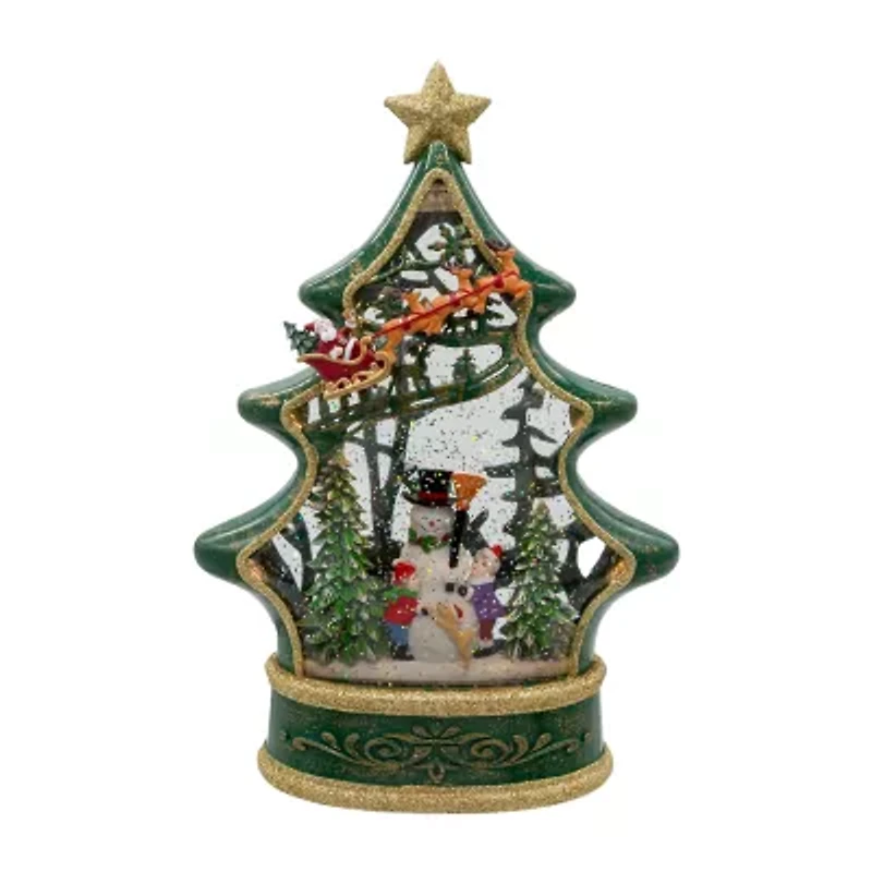 The 11.25-inch battery operated water snowman tree with Santa sleigh is a lovely addition to any tabletop holiday setup. The globe features an intricate design. Inside there are two pine trees, two children, a snowman and a dog. At the top, Santa is riding off in his sleigh. This uses 3 AA batteries, not included.