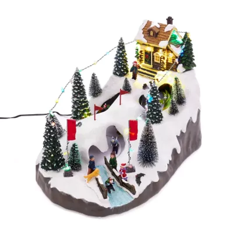Bring the snowy slopes into your home this holiday with Motion LED Christmas Skiing Village from Kurt Adler. This piece features a house at the top of the slope with skiers ready to head down the slopes. Along the sides are various Christmas trees covered in snow. When activated, the string of lights along the trees and houses light up and the skiers start to move.