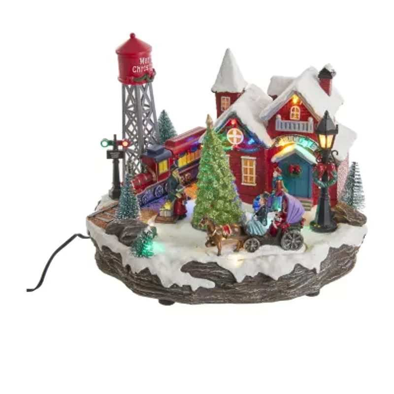 This 9.25-Inch Light Up Musical Christmas Village from Kurt S. Adler is a beautiful addition to any holiday decor. It features a glittered Christmas tree, lamp post, train, water tower, a horse drawn carriage and a welcome building. When switched on this piece lights up for a festive glow. Features UL DC 4.5 adapter. This musical item plays the classis tunes "Jingle Bells, We Wish You a Merry Christmas, Silent Night, Deck the Halls, Joy to the World, The First Noel, Hark. The Heard Angel Sing and Oh, Christmas Tree".
