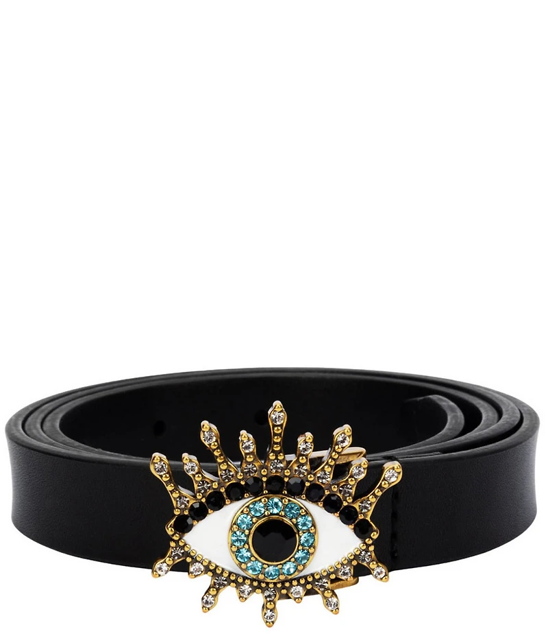 From Kurt Geiger, the London 0.78" Evil Eye Buckle Leather Belt features: Leather Embellished evil eye buckle Peg & hole closure Approx. 0.78" W S/M: approx. 32.5" L L/XL: approx. 38.5" L Spot clean Imported.