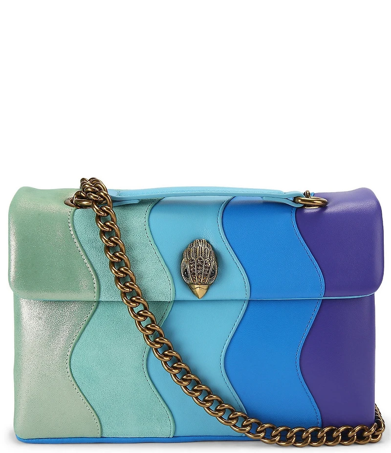From Kurt Geiger London, the Kensington Wave Shoulder Bag features: Leather & suede exterior in tonal blue waved pattern Brass hardware Fold-over closure Polyester lining Two interior compartments with small internal lining pocket Adjustable chain shoulder strap Approx. 10.6" x 6.8" x 3.5" bag; 12" - 20" strap drop Imported.