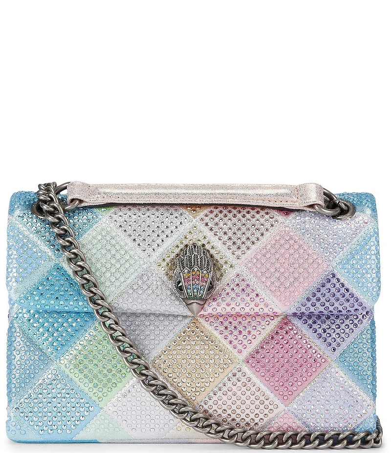 From Kurt Geiger London, the Fabric Medium Kensington Convertible Crossbody Bag features: Polyester exterior Crystal glass trim Polyester lining Flap/snap closure Convertible crossbody / shoulder chain strap Brass hardware Single interior compartment 1 kindness message pocket in back interior Approx. 8.66" L x 6.88" H x 6.10" W Approx. 22.44" crossbody strap drop Imported.