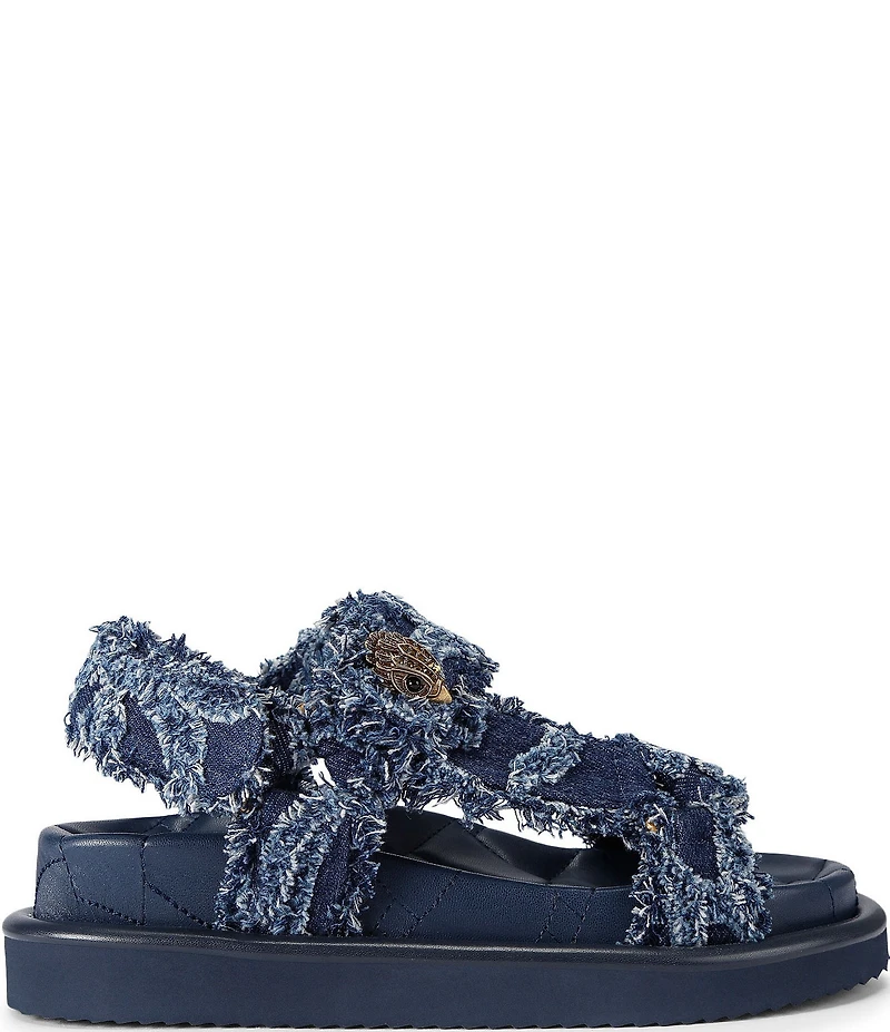 From Kurt Geiger London, the Orson Denim Logo Slingback Sandals feature: Frayed denim fabric upper Eagle head detail Hook-and-loop strap closure Synthetic lining Synthetic outsole Imported.