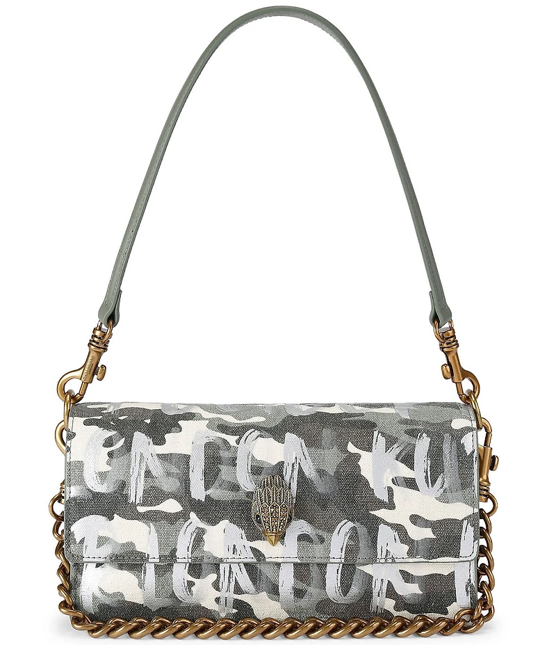 From Kurt Geiger London, the Sloane Soft Shoulder Bag features: Canvas exterior in camouflage print 100% synthetic lining Interior zipper pocket Brass hardware Two optional shoulder straps Approx. 23.22" strap drop Approx. 5.11'' H x 9.84'' L x 3.14'' D Imported.