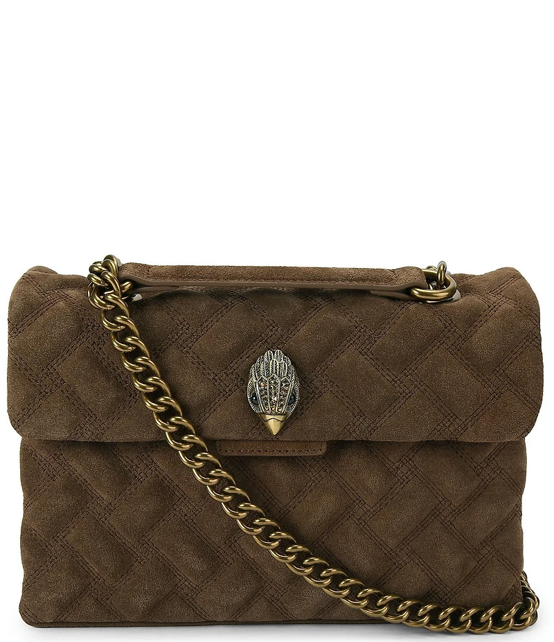 From Kurt Geiger London, the Suede Kensington crossbody shoulder bag features: Convertible crossbody / shoulder strap Suede exterior Polyester lining Flap / snap closure Bronze hardware Two interior compartment with small internal lining pocket Approx. 10.2" L x 6.7" H x 3.1" D Approx. 43.7" crossbody strap drop Approx. 25.5" shoulder strap drop Imported.