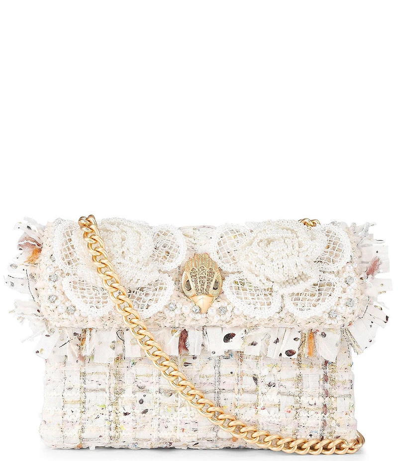 From Kurt Geiger London, the Tweed Mini Kensington Crossbody Bag features: Synthetic exterior adorned with floral applique w/ pearls & rhinestones Polyester lining Magnetic snap closure Gold hardware Single interior compartment Single convertible crossbody / shoulder chain strap Approx. 7.87" L x 5.51" H x 2.36" W Approx. 22.44" crossbody strap drop Imported.