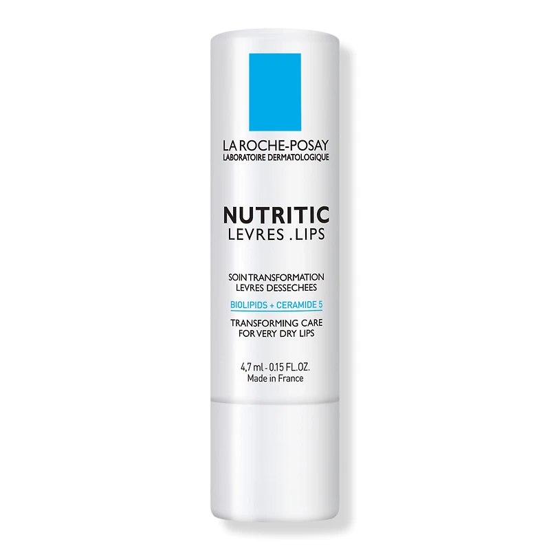 NUTRITIC LIPS 0.2OZ. Benefits: Moisturizes very dry lips. Softens chapped lips. Soothes and relieves sensitive lips. Non-greasy texture. Fragrance-Free. Suitable for sensitive skin. Key Ingredients: Ceramide 5: Ceramides are lipids naturally found in skin. They play an essential role to help retain moisture and maintain a healthy skin barrier. Ceramide 3, also known as Ceramide NP, is a skin-identical lipid used in LaRoche Posay's formulas to help support the skin moisture barrier.. Shea Butter: Sustainably sourced in Burkina Faso. Formulas with shea butter help restore the skin's hydrolipidic film and help skin feel soothed.. Glycerin: Derived from vegetable sources, it's an excellent humectant. It helps hydrate skin by absorbing water from the surrounding environment.. Vitamin E: Tocopheryl acetate is a synthetic, more stable form of vitamin E. It has antioxidant properties to help neutralize damaging free radicals.. :
