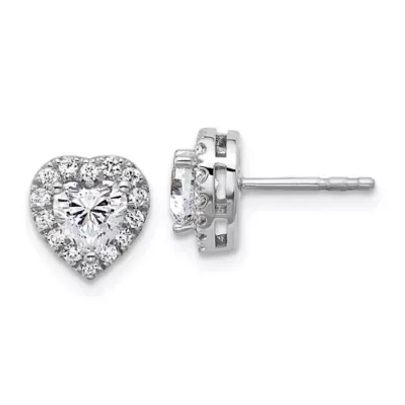 A gift she will treasure forever, these adorable 14K white gold halo style heart earrings will never disappoint. Each earrings showcase gorgeous heart shaped lab grown diamond at center passionately haloed by small round lab grown diamonds for a dazzling allure. Post and push back closures ensures proper security to these stud earrings. Lab grown diamonds are of VS/SI+ clarity and weighs 1.28 ct. t.w. 2 Post back, 30 Diamond Color rating: G Clarity rating: VS/SI+ Polished finish Prong setting INDIA Imported Product Specifications 8.45-mm Length x 8.1-mm Width 1.28 ct. t.w. Diamond Material & Care Gold Metal, White gold Clean with a soft cloth.
