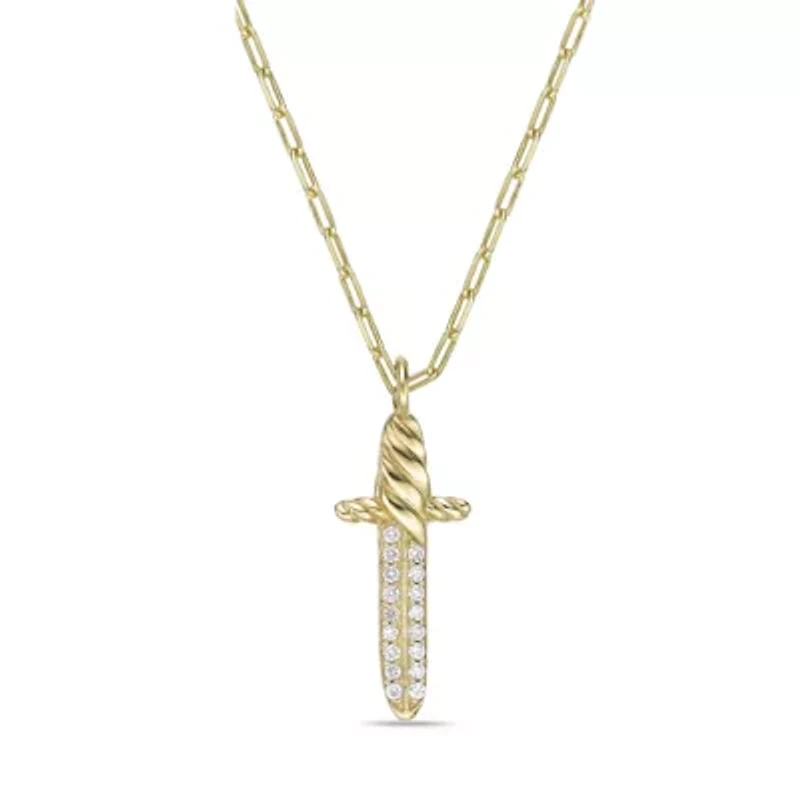 Ignite your passion for elegance and sophistication with our exquisite 18K Yellow Gold Plated Sterling Silver 0.15 Carat Lab Grown Diamond Sword Pendant. This stunning necklace is not just a piece of jewelry; it's a symbol of strength and resilience. Picture yourself wearing this captivating sword pendant, a delicate balance of power and grace that encapsulates your inner warrior. Whether it’s a night out on the town or an intimate dinner, this pendant transforms any outfit into a statement of style and character, empowering you to express yourself freely. Crafted with care from high-quality 925 yellow gold plated sterling silver, this necklace shines brilliantly with its luxurious gold finish. The pendant features a stunning array of sparkling 0.15 carat total weight lab-grown diamonds that adds a touch of glamor and sophistication, effortlessly catching the light with every turn. Suspended on an 18-inch paperclip chain secured with a durable lobster clasp, this necklace is perfect for layering or wearing alone, making it a versatile addition to your jewelry collection. Whether you're heading to the office or enjoying a weekend outing, this necklace is designed to complement every facet of your lifestyle. Don’t miss out on the opportunity to own a piece that exudes charm and elegance, making you feel special every day. With its unique design and premium materials, this sword pendant is not just an accessory; it’s a testament to your individuality. Embrace your style and elevate your jewelry game today! Make this stunning piece yours and let your elegance shine! Lobster closure, 19 Color rating: F, D Clarity rating: VVS Polished finish Prong setting Thailand Imported Product Specifications 18-in. x 11mm x 3mm 0.15 Material & Care Metal, Gold plated Clean with a soft bristle brush or cloth and warm soapy water.