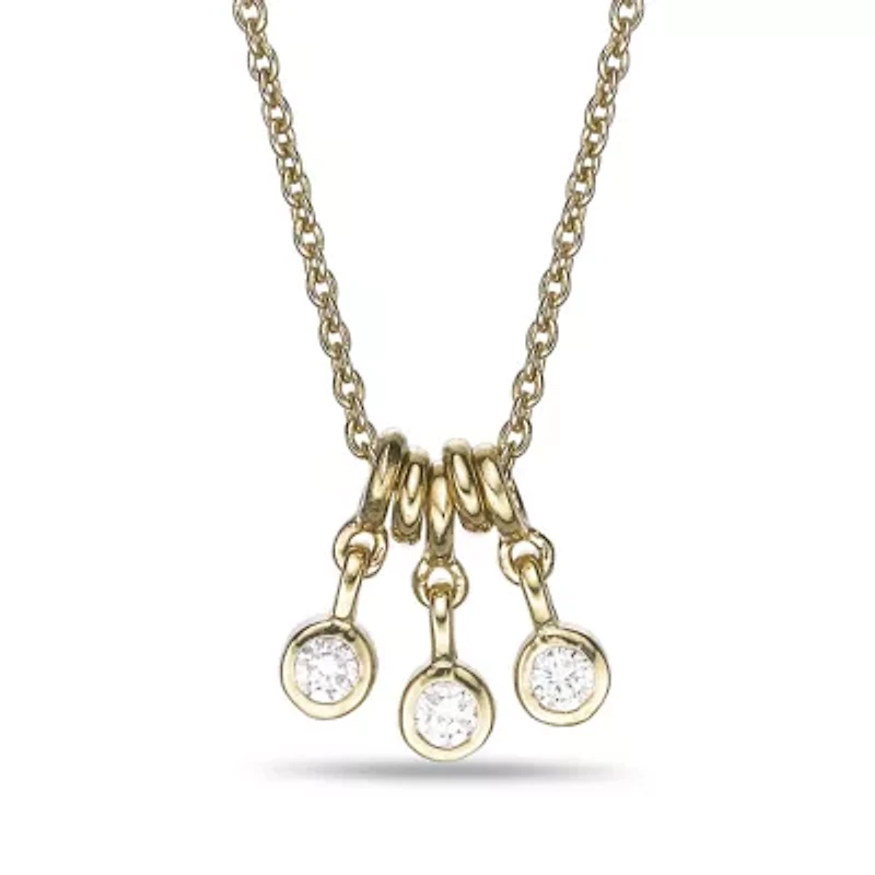 Illuminate Your Elegance with Our 18K Yellow Gold Plated Sterling Silver Pendant Embrace the allure of refined luxury with our stunning 18K Yellow Gold Plated Sterling Silver 0.01 Carat Lab Grown Diamond Dangling Pendant. Imagine the sparkle in your loved one's eyes as they unwrap this exquisite piece, a true embodiment of sophistication and modern elegance. Perfect for elevating your everyday attire or adding a touch of dazzle to special occasions, this pendant is not just an accessory; it’s a heartfelt expression of love, style, and commitment. Crafted with meticulous attention to detail, this gorgeous necklace features three bezel set lab-grown diamonds that captures radiance and brilliance in every movement. The premium 925 sterling silver base, elegantly plated in 18K yellow gold, ensures durability while delivering a warm, luxurious glow. Suspended from an adjustable 18-inch cable chain with a secure lobster clasp, this pendant is designed for comfort and ease, making it a versatile piece suitable for both casual and formal settings. Whether you're dressing up for a romantic dinner or seeking daily glam, this necklace will effortlessly complement your style. Don't miss the opportunity to adorn yourself or surprise a cherished loved one with a timeless treasure that conveys elegance and grace. With its thoughtful design and quality materials, this pendant promises to be cherished for years to come. Treat yourself or gift someone special—click 'Add to Cart' now and let this stunning pendant become a shining part of your collection! Lobster closure, 3 Color rating: D, F Clarity rating: VVS Polished finish Bezel setting Thailand Imported Product Specifications 18-in. x 11mm x 3mm 0.10 Material & Care Metal, Gold plated Clean with a soft bristle brush or cloth and warm soapy water.