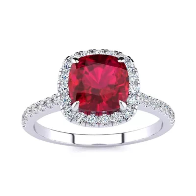 This ruby ring features one 7mm cushion cut created ruby gemstone. It is surrounded by 38 sparkling diamonds totaling 1/2 carat in I-J color, I1-I2 clarity. Total carat weight is approximately 2 carats. This ring is in sterling silver. 39 Color rating: I Clarity rating: I1-I2 Polished finish Prong setting Choking hazard Warranty available, Limited liability warranty, 60 Days China Imported Product Specifications 9x9mm 2 Carats Material & Care Metal, Sterling silver Use silver polishing cloth on silver items.