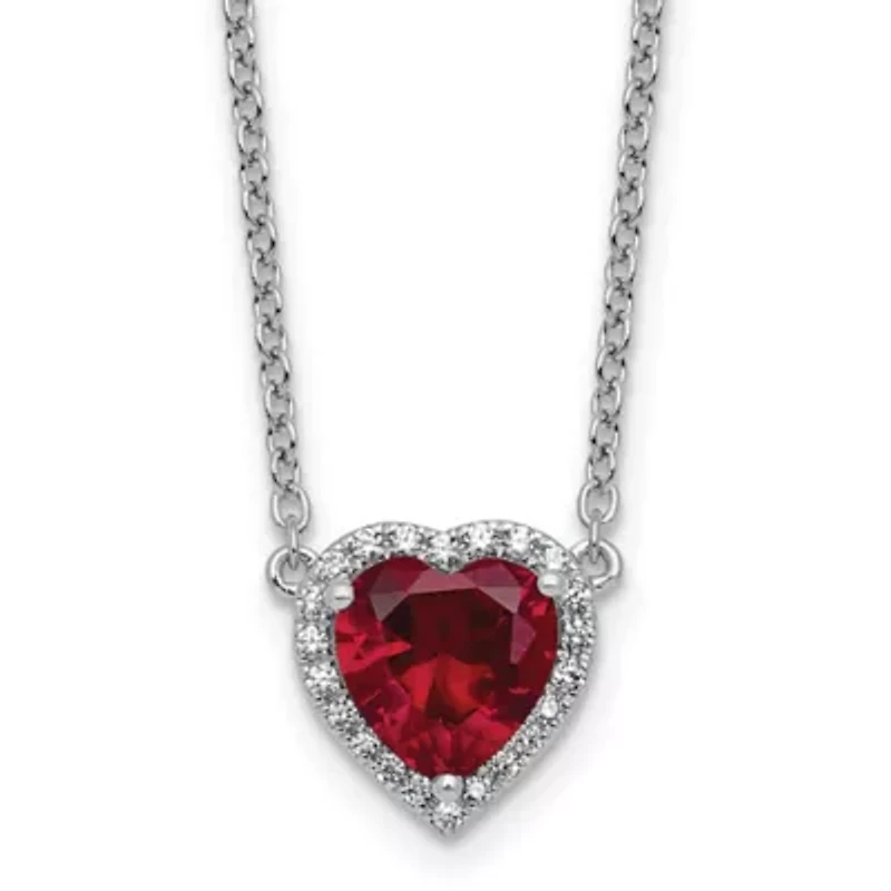 A symbol of modern romance, this 14K white gold gemstone and lab grown diamond heart necklace makes an ideal gift for your special someone. Showcasing beautiful heart pendant decorated with single 2.50 ct. t.w. genuine red ruby gemstone and 1/6 ct. t.w. VS+ clarity lab grown diamonds this 18-inch long cable chain necklace is sure to turn heads. This stunning necklace secures with a lobster clasp for perfect hold. Lobster closure, 1 Ruby, 22 Diamond Color rating: F Clarity rating: VS+ Polished finish Prong setting INDIA Imported Product Specifications 13-mm Length x 12.5-mm Width x 18-in. 2.5 ct. t.w. Ruby, 1/6 ct. t.w. Diamond Material & Care Gold Metal, White gold Clean with a soft cloth.