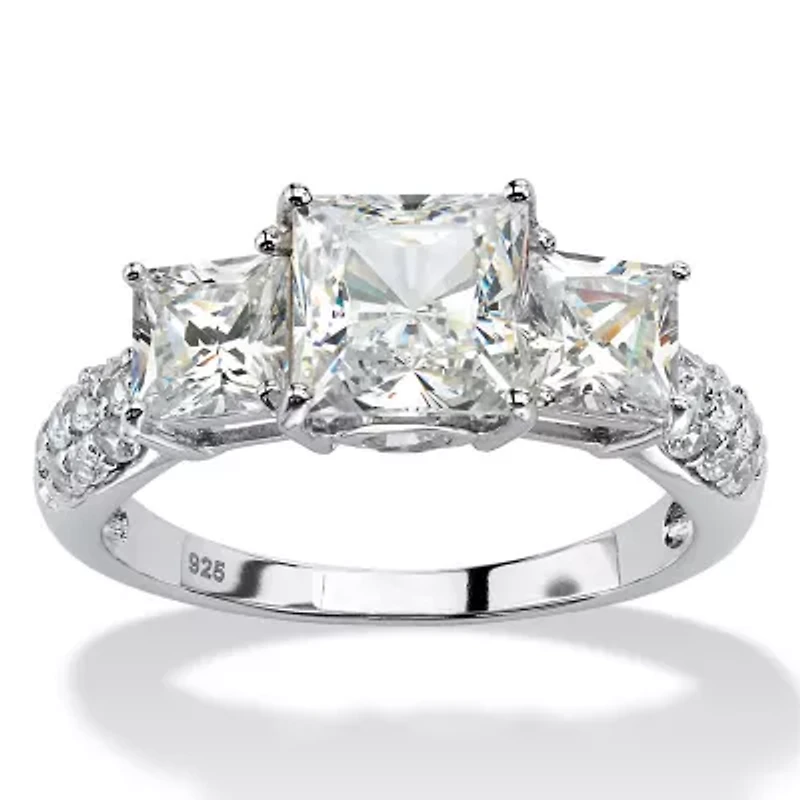 Three-stone engagement rings are classic but stunning in their design. The larger middle stone of this gorgeous princess-cut created white sapphire ring is highlighted beautifully by the two smaller sapphire princesses flanking each side. Smaller round sapphire accents travel down the shank for extra sparkle. 3.43 carats T.W. Crafted in platinum-plated sterling silver. Sizes 6-10.Main Stone: 1 Princess Faceted Cut Lab Created Sapphire, 1.16 carats, 7 mm x 7 mmAccent Stone: 24 Lab Created Sapphires 2.27 cttwPlatinum-Plated Sterling Silver; Contains 2.40 grams of Sterling SilverMeasures: 23 mm wide x 7.5 mm long x 6.5 mm high; Shank Width: 2.0 mm wideIncludes gift box and drawstring pouchPlatinum-Plated Sterling SilverContains 2.40 grams of Sterling SilverShank Width: 2.0 mm wideDimensions: 23 mm wide x 7.5 mm long x 6.5 mm highIncludes gift box and drawstring pouch 25 Polished finish Prong setting Warranty available, Limited liability warranty, 30 Days Thailand Imported Product Specifications 23 mm wide x 7.5 mm long x 6.5 mm high; Shank Width: 2.0 mm wide 3.4299999999999997 Material & Care Metal, Sterling silver Clean with a soft cloth.
