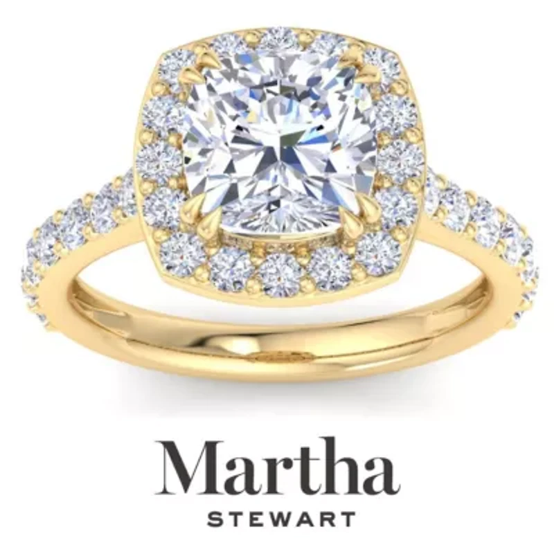 Showcasing class, style and timeless sophistication, the Martha Stewart fine jewelry collection is here to be celebrated. This Martha Stewart lab grown diamond engagement ring features a 3 carat cushion cut center lab grown diamond. It is accented with 30 round lab grown diamonds in a halo in G-H color, VS clarity. Total carat weight is approximately 4 carats. This ring is available in 14 karat white gold and 14 karat yellow gold. This Martha Stewart ring has a double-prong setting and is comfort fit for a luxurious feel on your finger. This ring also has a patent pending mirrored setting which increases the primary diamond's brilliance and beauty. Whether for a special occasion or to add a touch of elegance to everyday wear, this ring is sure to become a beloved heirloom. Martha Stewart’s dedication to quality and attention to detail are reflected in every piece, making this collection a celebration of timeless beauty and exceptional craftsmanship. 31 Clarity rating: VS Polished finish Prong setting Choking hazard Warranty available, Limited liability warranty, 60 days USA Imported Product Specifications 12mm Material & Care Metal, Yellow Gold Clean with a soft bristle brush or cloth and warm soapy water.
