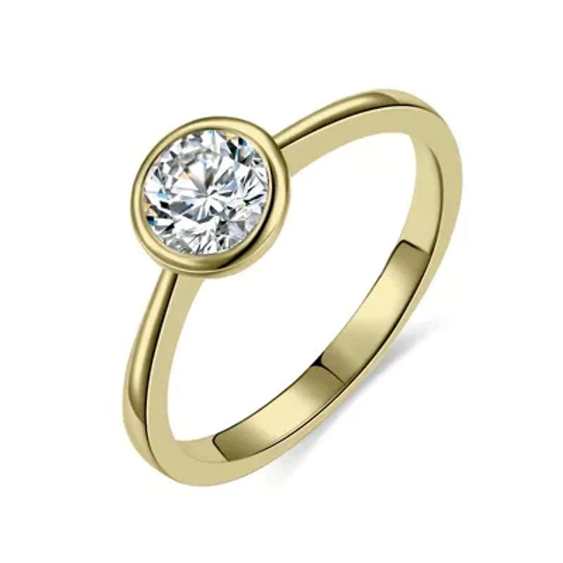 Refresh your look with this modern white gold plated ring featuring a sparkling round brilliant cut cubic zirconia bezel set on a slim band. Add an understated style made to get noticed and perfect for day, night, or work. This ring is available in white gold plating, 14K gold plating, or 18K rose gold plating. Available in sizes 5-8. No clasp Polished finish Bezel setting Imported Product Specifications 7 Material & Care Rhodium-plated base metal Clean with a soft cloth.