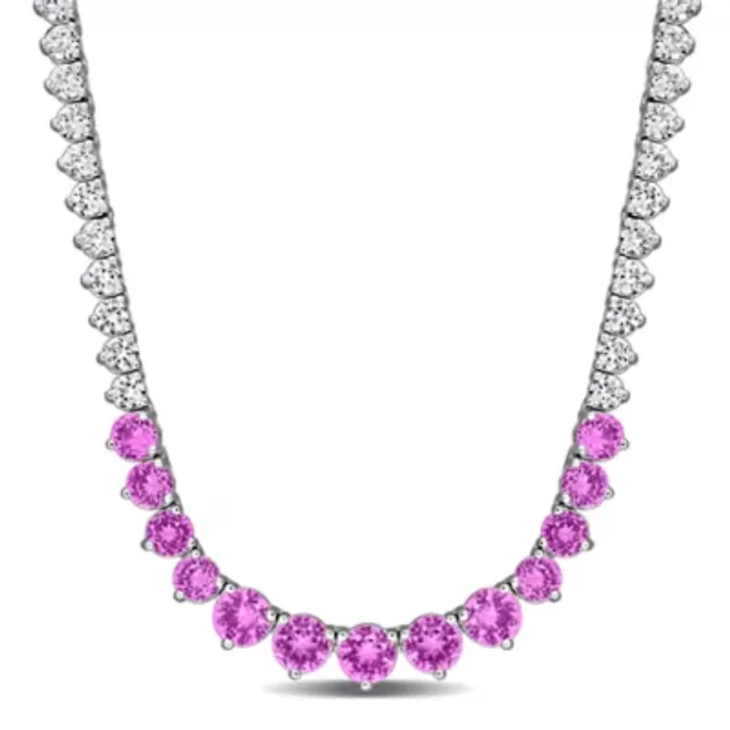Elegant and dazzling, this sterling silver necklace features 22.3 CT of created pink and white sapphires. The box clasp ensures a secure fit, while the brilliant gemstone arrangement adds a luxurious, eye-catching touch. Perfect for elevating any outfit with refined sophistication. Box clasp, 13 created pink sapphire, 113 created white sapphire Polished finish Prong setting Warranty available, 60 days Thailand Imported Product Specifications 18" 22.3ct. t.g.w. created pink sapphire, created white sapphire Material & Care Sterling Silver Metal, Sterling silver Clean with a soft cloth.