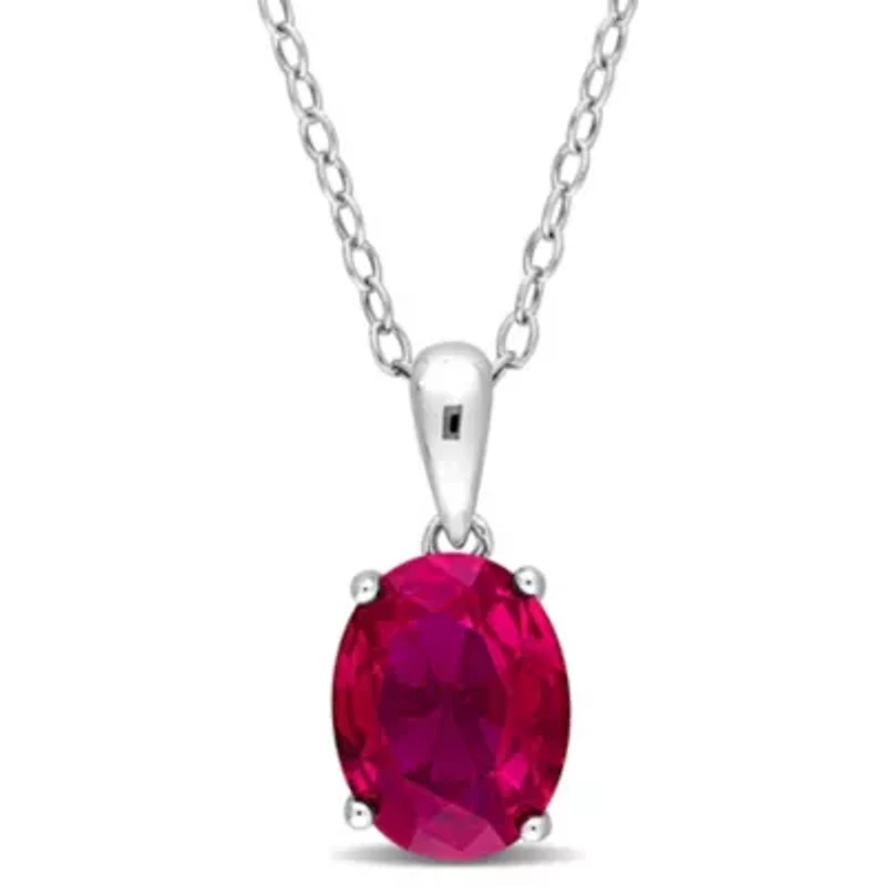 Add an ethereal charm to your outfits by adorning this eye-catching oval created ruby solitaire pendant with chain. This pretty pendant is crafted in sparkling sterling silver and features one oval-cut created ruby solitaire gemstone in a classic heart basket setting for a solid look. This pendant is suspended on an 18-inch round cable chain. Polished to brilliant shine, this beautiful piece of jewelry makes dressing up easy for any occasion. Spring ring clasp, 1 created ruby Polished finish Prong setting Warranty available, 60 Days China Imported Belk Exclusive Product Specifications 7.0-mm width x 15-mm height, 18" 2.95 ct. t.g.w. created ruby Material & Care Sterling Silver Metal, Sterling silver Clean with a soft cloth.