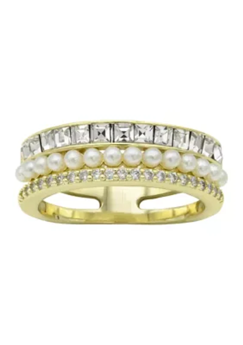 Lab Created Gold Tone Pearl, Pavé and Channel Set Cubic Zirconia Tri Row Band