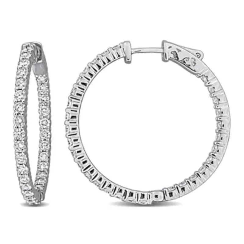 Make a statement with these lab-grown diamond inside-out hoop earrings. Set in 14k white gold, sparkling diamonds encircle the hoops for brilliance from every angle. Their modern design combines elegance with contemporary style, creating a versatile accessory for both everyday wear and special occasions. These hoops exude sophistication, refined sparkle, and timeless charm, adding luxury to any look. Hinge post earring, Jewelry clasp, 60 lab grown diamond Color rating: G, H Clarity rating: VS1-VS2 Polished finish Prong setting Warranty available, 60 days Thailand Imported Product Specifications 2.4-mm width x 32-mm height 3.3 ct. t.w. lab grown diamond Material & Care 14K White Gold Metal, White gold Clean with a soft cloth.