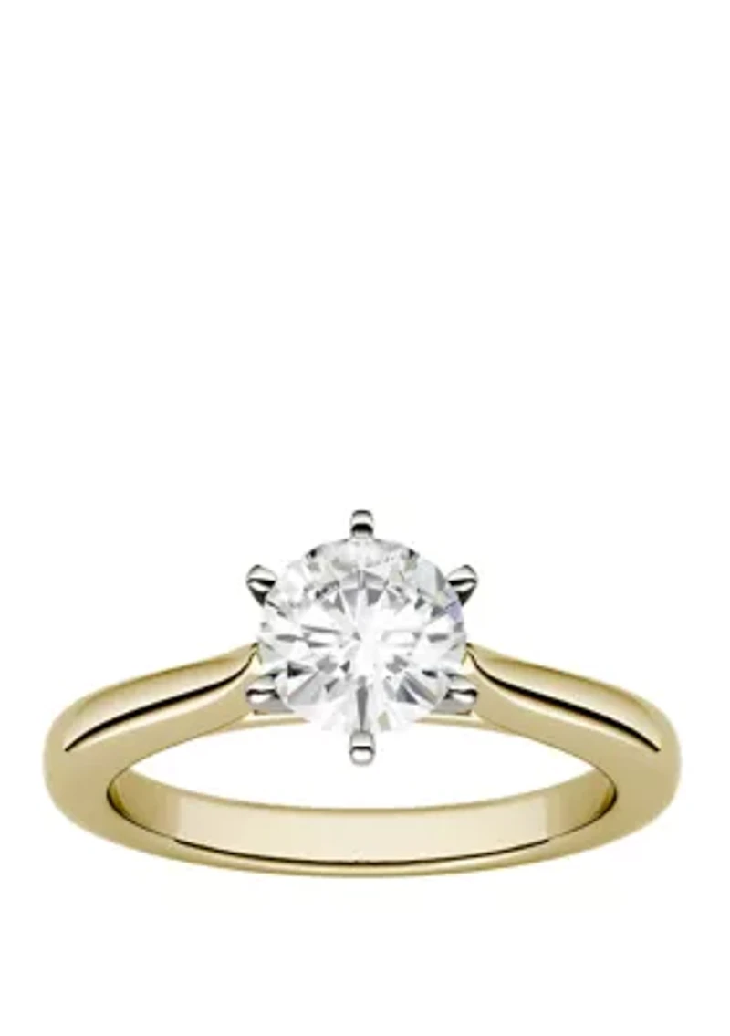 Pledge to love, honor, and cherish her with this exquisite Charles & Colvard solitaire Moissanite engagement ring. Brightly polished in warm 14k yellow gold, this alluring ring showcases a 6.5-millimeter round-cut stone secured in a six-prong setting. Buffed to a brilliant luster, this 1-carat total weight is a classic and romantic symbol of your love. 1 Moissanite Color rating: G, H, I Clarity rating: SI-I2 Slip-on Polished finish Prong setting Comfort fit Lifetime limited liability warranty Imported Product Specifications 7.8 mm L x 2.65 mm W x 6.45 mm H 1 ct. t.w. Diamond Equivalent Weight Material & Care Metal Clean with a soft cloth