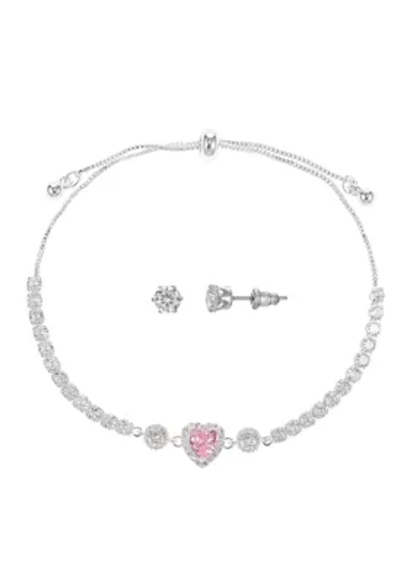 Lab Created Silver Plated CZ Bolo Tennis Bracelet with Pink Heart and Stud Earring SetLab Created Silver Plated CZ Bolo Tennis Bracelet with Pink Heart and Stud Earring SetLab Created Silver Plated CZ Bolo Tennis Bracelet with Pink Heart and Stud Earring Set