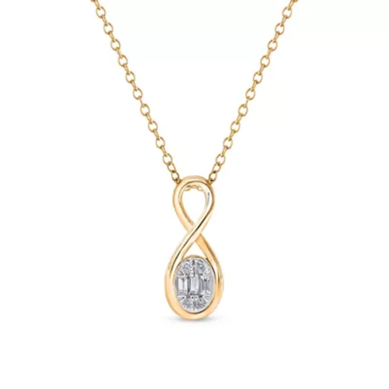 This sophisticated 1/6 ct. t.w. pendant, apart of our Aeena collection, exudes elegance with its oval frame featuring a beautiful arrangement of lab grown baguette and round diamonds. Set in a luxurious gold infinity shaped design, the pendant symbolizes eternal grace and style. Crafted in sterling silver, it hangs from an 18-inch cable chain and is secured with a reliable spring-ring clasp. Perfectly suited for the modern woman, this pendant adds a touch of timeless charm to any outfit, making it an ideal piece for both everyday wear and special occasions. Jewelry clasp, 7 Color rating: H, G Clarity rating: SI2 Polished finish Prong setting India Imported Product Specifications 18-in length x 19.68-mm height x 8.2-mm width 0.16 ct. t.w. Material & Care Sterling Silver Metal, Sterling silver Use silver polishing cloth on silver items.