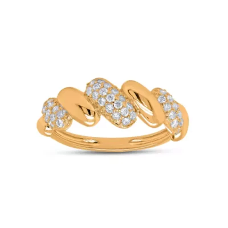 This bold gold lab grown fashion ring, part of our Eos Lumina collection, is the perfect accent for any woman seeking a modern and versatile design in an everyday wearable ring. Expertly crafted in sterling silver, the ring features a striking pattern and features shimmering round lab grown diamonds totaling up to 3/8 ct. t.w., creating a subtle yet radiant sparkle. Its sleek and contemporary design exudes sophisticated charm, making it an ideal piece for daily wear while adding a touch of elegance to any outfit. 46 Color rating: H, G Clarity rating: SI2 Polished finish Prong setting India Imported Product Specifications 8.2-mm height x 2-mm width 0.41 ct. t.w. Material & Care Sterling Silver Metal, Sterling silver Use silver polishing cloth on silver items.