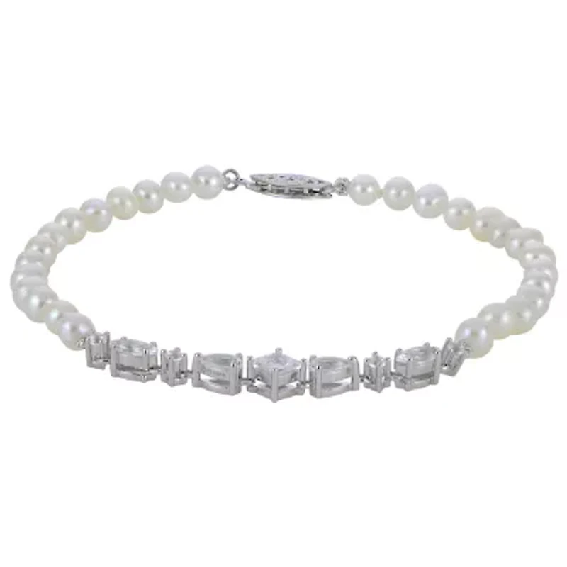 A luminous strand that feels both classic and unexpected. This 7.5" bracelet pairs glowing white cultured freshwater pearls with a graceful constellation of marquise, pear, square, and round created white sapphires. Each stone is thoughtfully placed to catch the light from every angle, while the intricately detailed sterling silver clasp adds a final touch of old-world romance. Fish hook closure, 9 Polished finish Imported Product Specifications 1.5700 Material & Care Metal, Sterling silver Clean with a soft cloth.