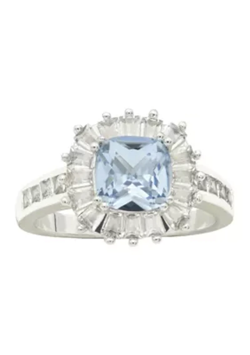Lab Grown Cushion Cut Water Sapphire Crystal Ring with Cubic Zirconia Baguette Halo in Chattanooga, TN